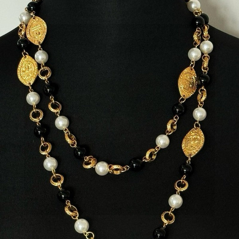 18K CC Long Black & White Pearls Necklace